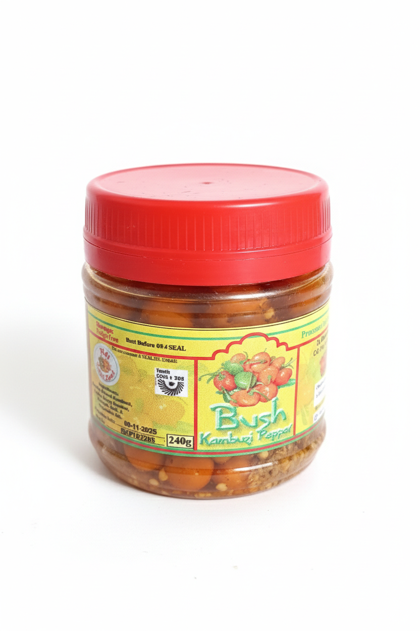 Bush kambuzi pepper, a mixture of freshly picked kambuzi, garlic and curry powder, vinegar, salt and vegetable oil.